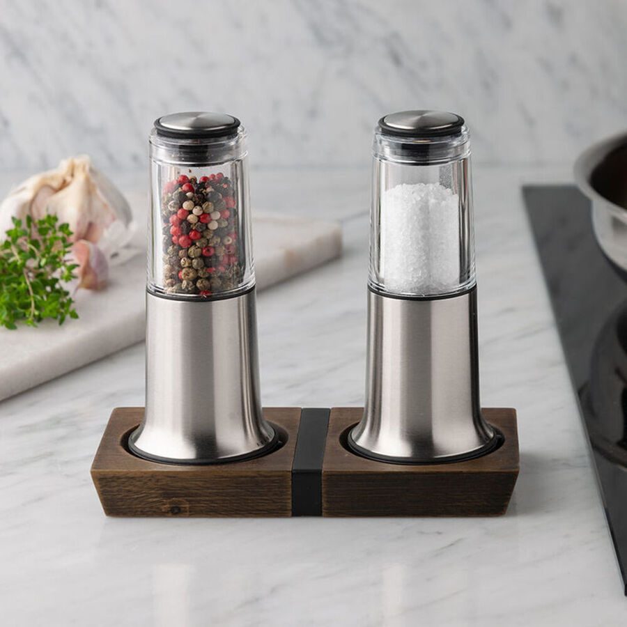 ENSEMBLE MOULIN À POIVRE ET SEL WAVE - 20 CM. Rehaussez le goût de tous vos plats d'une touche gastronomique grâce à l'ensemble de moulin à poivre et moulin à sel de Trudeau. Ces moulins fonctionnels et sans gâchis sont conçus pour empêcher les dépôts de sel et de poivre sur vos comptoirs. Chaque moulin est muni d'un broyeur en.