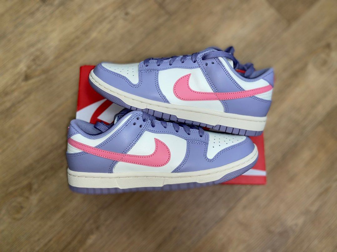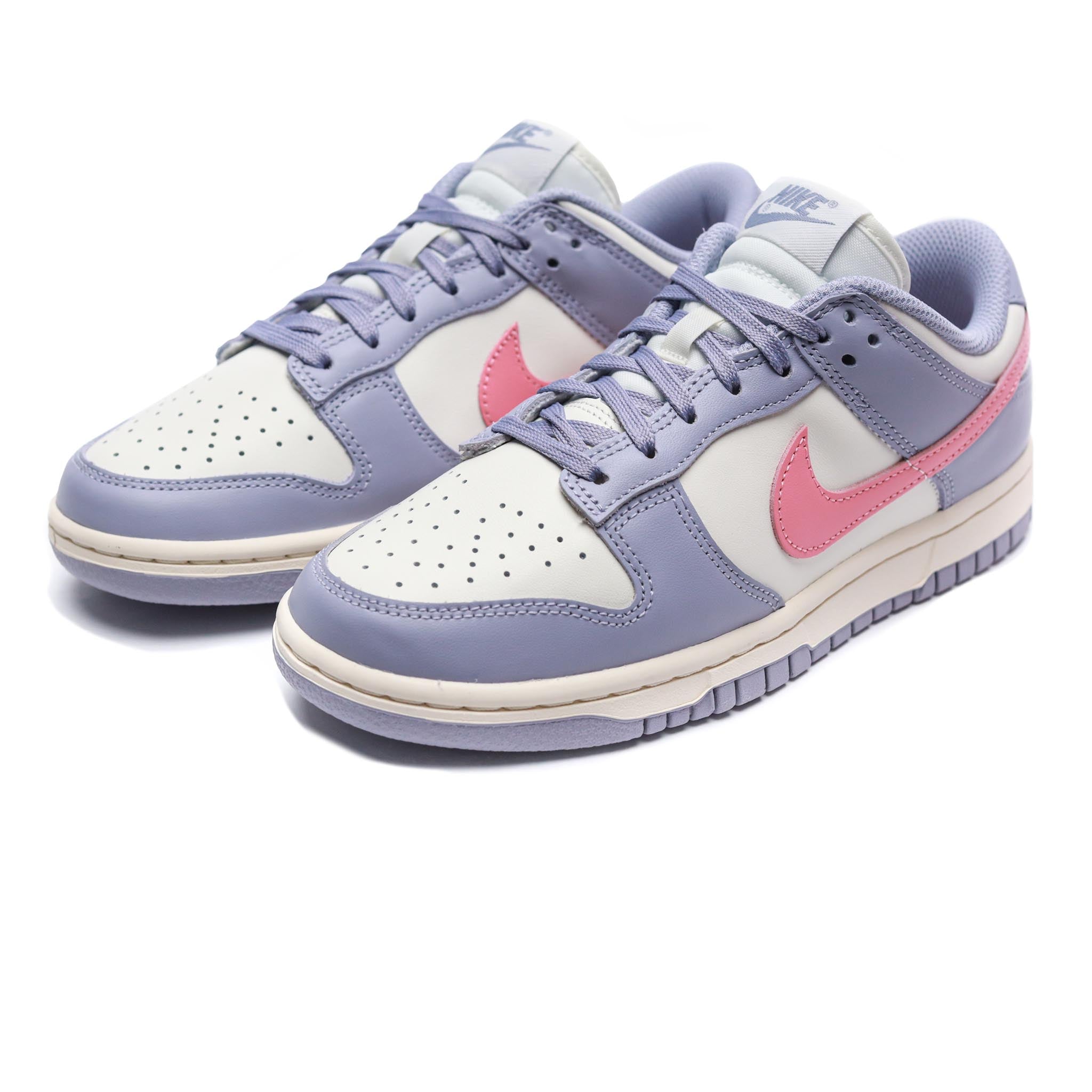 11.5. $110. 12. $115. Facts. The Nike Women's Dunk Low 'Indigo Haze' presents a pastel colorway of the performance hoops shoe turned street-ready wardrobe staple. The low-top carries a smooth all-leather upper, highlighted by a white base with lilac overlays and a pink Swoosh. A breathable nylon tongue works in tandem with a low-cut.