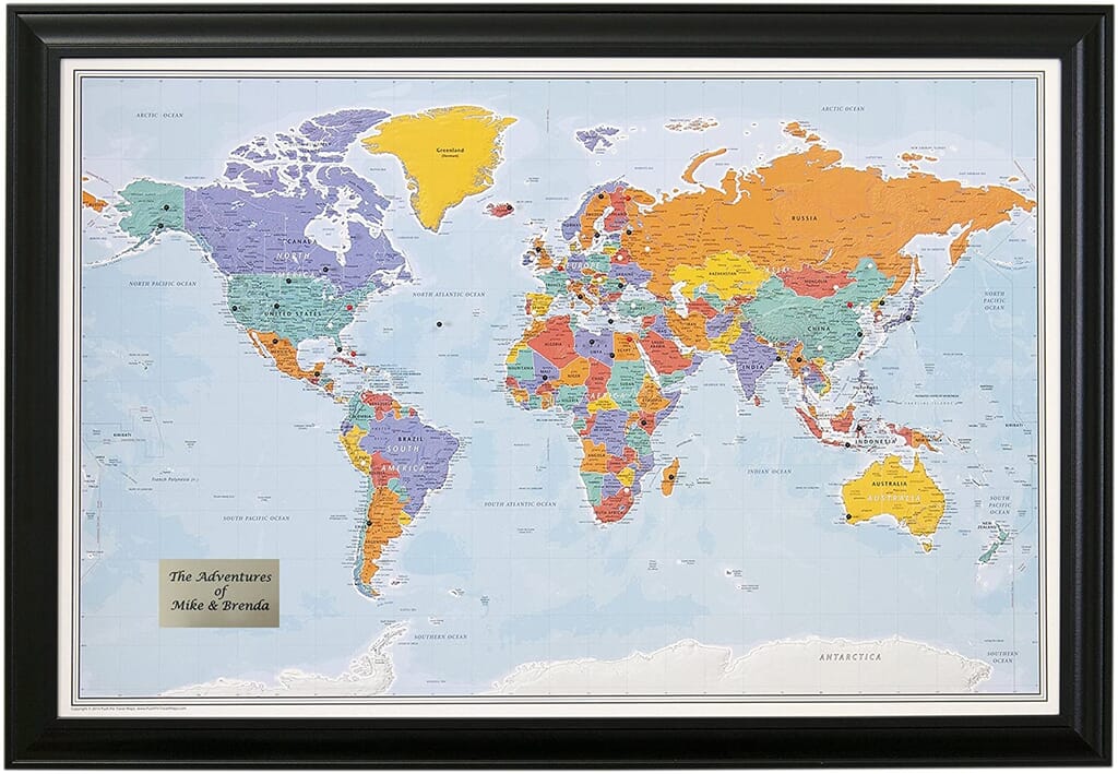Framed travel map with pins - Pantone palette. From: $ 199 $ 179. Select options. 1. 2. →. Track and plan global journeys with our World Push Pin Travel Maps, a visual log of your adventures. Our Push Pin World Maps are made with the highest quality materials and come with a lifetime warranty on the canvas and framed versions.