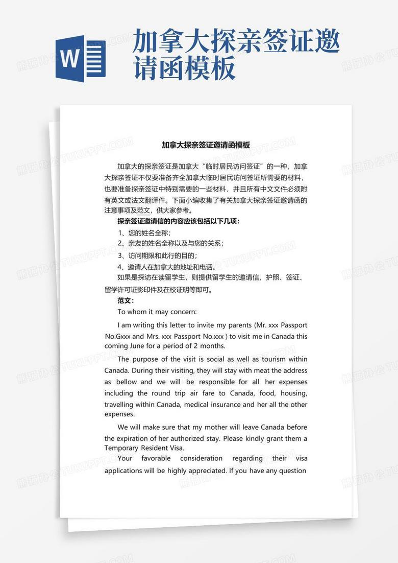 篇一 :加拿大探亲邀请函. 加拿大探亲邀请函. to whom it may concern: i am writing this letter to invite my parents (mr. xxx passport no.gxxx and mrs. xxx passport no.xxx ) to visit me in canada this coming june for a period of 2 months. the purpose of the visit is social as well as tourism within canada. during their visiting.
